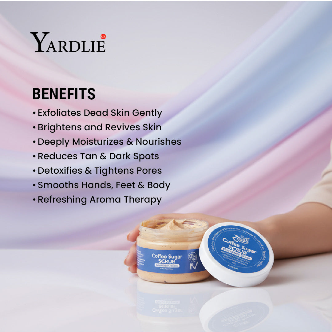 Sucrose (Brown Sugar), Helianthus Annuus (Sunflower) Oil, Maranta Arundinacea (Arrowroot) Powder, Caprylic/Capric Triglyceride, Macadamia Ternifolia (Macadamia) Seed Oil, Coffee Arabica (Coffee) Grounds, Glyceryl Stearate SE, Cetearyl Alcohol,Silica, Butyrospermum Parkii (Shea) Butter, Elaeis Guineensis (Palm) Butter, Parfum, Cocos Nucifera (Coconut) Oil, Simmondsia Chinensis (Jojoba) Seed Oil, Curcuma Longa (Turmeric) Root Extract, Bisabolol, Benzyl Alcohol.