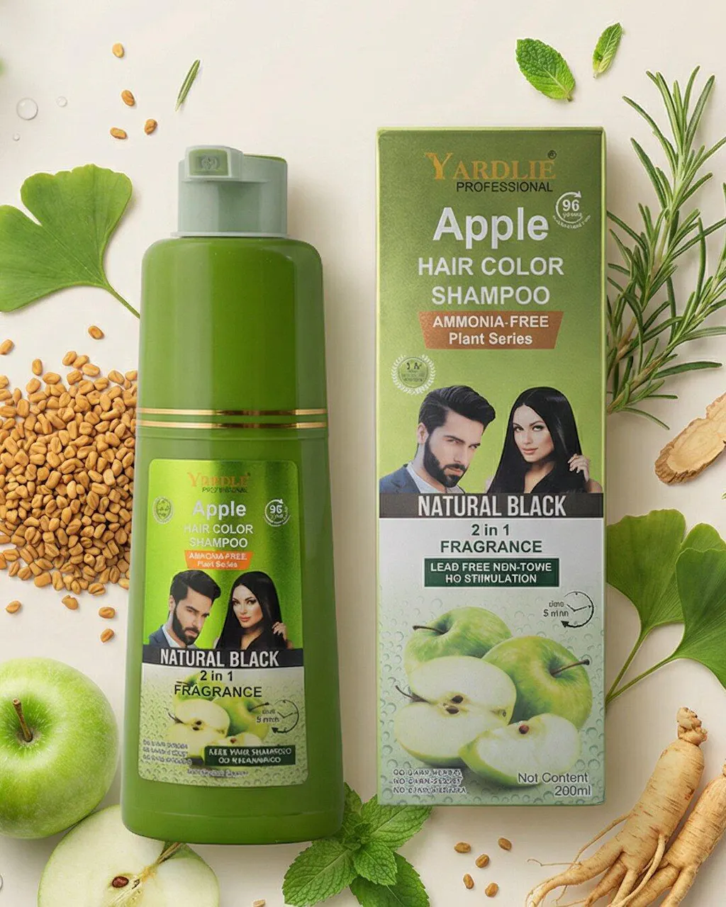 Yardlie Apple Dark Brown / Natural Black Hair Color Shampoo (UK-Based Formula) — 200ml of rich, vibrant color with 100% grey coverage that lasts up to 4 weeks. Featuring a unique dual-chamber bottle, it makes application quick, easy, and mess-free — no salon visit needed.